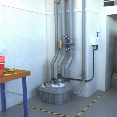 - Когда центральная канализация находится на высоте потолка, необходимо поднимать стоки до ее уровня. В это случае организуется централизованная насосная станция, где стоки от всего оборудования сначала собираются в едином резервуаре, а затем откачиваются, поднимаются и транспортируются в канализационную систему. Таким образом, организуется герметичная насосная станция, которая может быть установлена в техническом помещении.