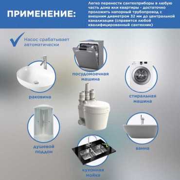 Основное назначение санитарного кухонного насоса SANISWIFT - вынести кухню в коридор, на балкон/лоджию, в другую комнату. Насос позволяет быстро провести напорную канализацию до ближайшей точки стационарной канализации и перенести мойку на кухне к окну или просто в любое другое место. Дополнительно вы можете подключить к данной модели посудомоечную и стиральную машины.
