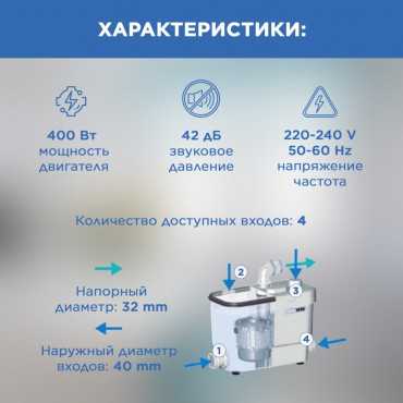 Прибор имеет 4 выхода, диаметр выпускного отверстия составляет 40 мм. Класс энергобезопасности – 1, класс IP -защиты – IP44. Звуковое давление составляет 42 дБ (А), что является минимальным значением. Турбинный двигатель с мощностью в 400 Вт обеспечивает высокую производительность при низком потреблении электроэнергии (оптимальное напряжение источника питания составляет 220–240 В или 50 Гц).