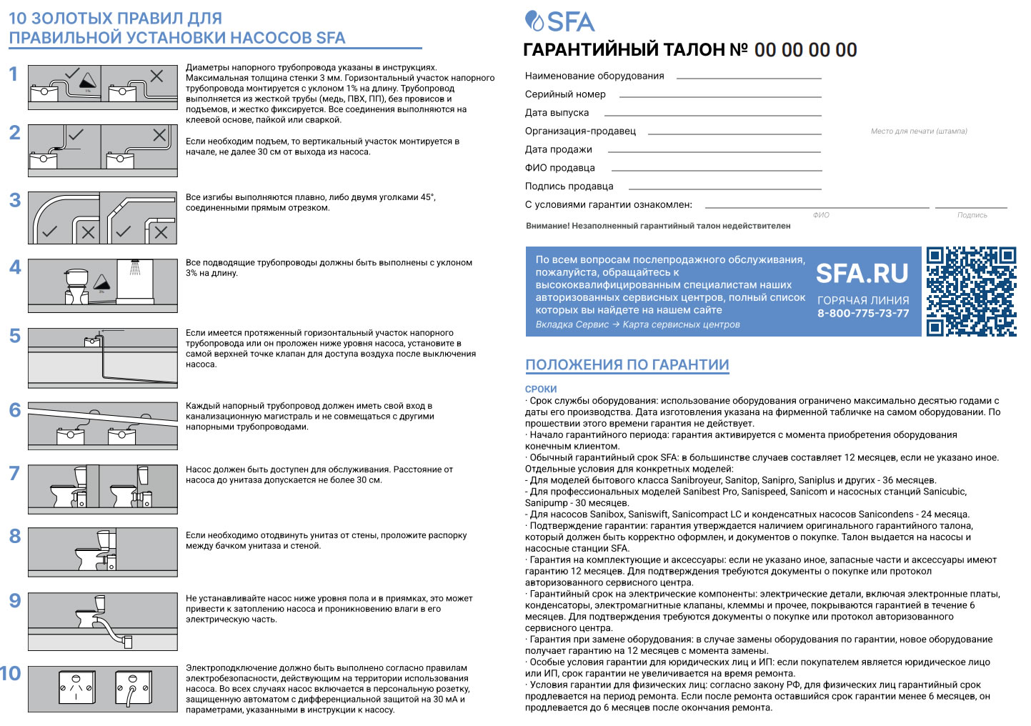 Подтверждение гарантии: гарантия утверждается наличием оригинального гарантийного талона, который должен быть корректно оформлен, и документов о покупке. Талон выдается на насосы и насосные станции SFA.