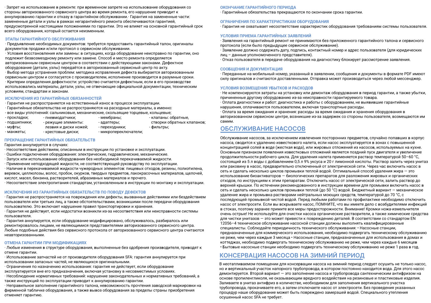 Просим вас ознакомиться с положениями о гарантии на насосы и станции SFA.