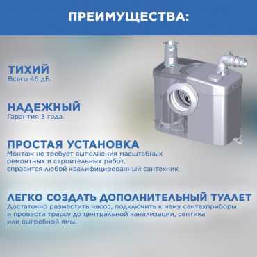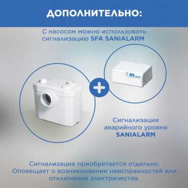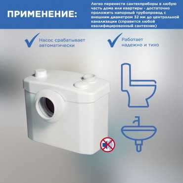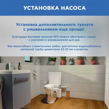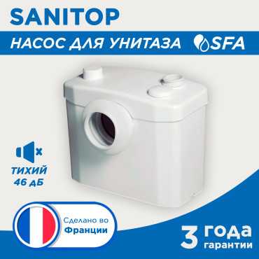 Все детали этого фекального насоса-измельчителя для туалета изготовлены из материалов повышенной прочности, по европейским стандартам. Вся продукция компании SFA имеет международные сертификаты качества. Мощность, встроенного в насос, двигателя составляет 400 Ватт, что позволяет ему эффективно откачивать любое количество сточных вод. Нож измельчителя сделан из нержавеющей стали. Sanitop позволяет легко и быстро разместить санузел даже на небольшой площади. Главное условие — наличие воды и электричества, стационарная канализация может быть далеко (высоко) или отсутствовать совсем (вместо нее установлен септик или есть сточная яма). Иллюстрированная инструкция подробно показывает все шаги установки и подключения насоса.