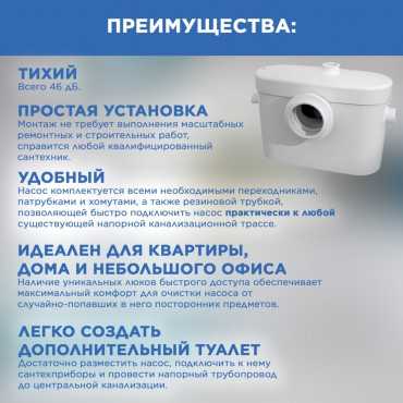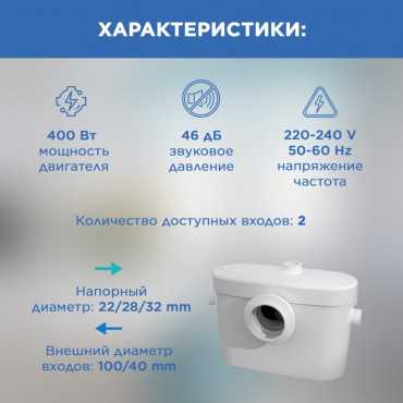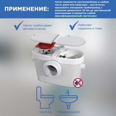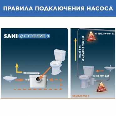 Все детали этого фекального насоса-измельчителя для туалета изготовлены из материалов повышенной прочности, по европейским стандартам. Вся продукция компании SFA имеет международные сертификаты качества. Мощность встроенного в насос двигателя составляет 400 Ватт, что позволяет ему эффективно откачивать любое количество сточных вод. Винт измельчителя металлический, поэтому его время износа значительно увеличено. Saniaccess 2 легко и быстро можно разместить даже на небольшой площади. Главное условие — наличие воды и электричества, стационарная канализация может быть далеко (высоко) или отсутствовать совсем (вместо нее установлен септик или есть сточная яма). Иллюстрированная инструкция подробно показывает все шаги установки и подключения насоса.